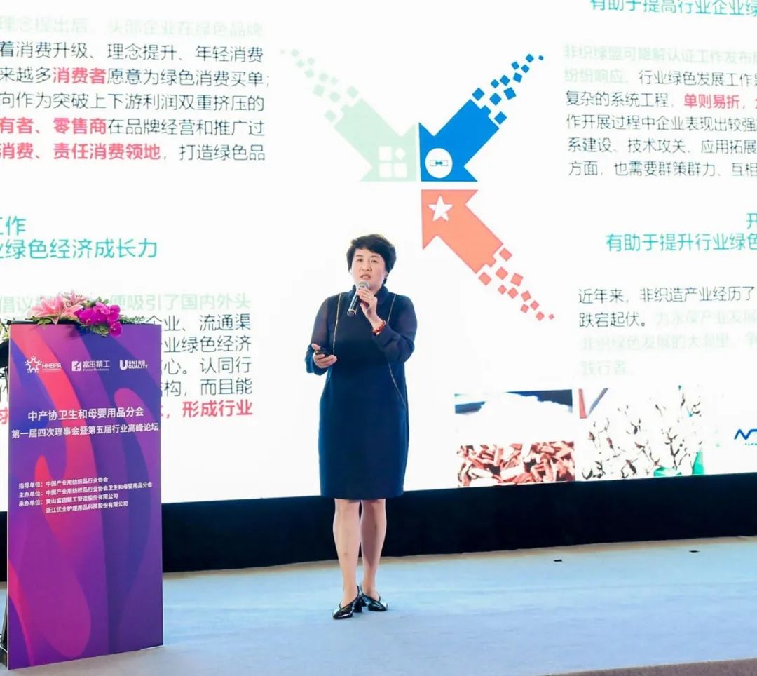V dnešnom svete sa zelený rozvoj stáva dôležitým faktorom pri budovaní udržateľnej konkurencieschopnosti a budúcim hlasom priemyselného rozvoja. Viceprezident Li Guimei predstavil súčasnú situáciu ekologického trvalo udržateľného rozvoja v odvetví netkaných textílií, netkanú zelenú alianciu asociácie strednej triedy a najnovší pokrok v certifikácii „biologicky odbúrateľných“ na pozadí príslušných politík v oblasti rozvoja zelene. ekonomiky vo svete a Číne. Keď hovoril o novej situácii a nových výzvach, ktorým čelí ekologický a trvalo udržateľný rozvoj odvetvia netkaných textílií v novej ére, Li Guimei povedal, že budúce pracovné priority tohto odvetvia zahŕňajú najmä tieto štyri aspekty: po prvé, postupne zlepšovať infraštruktúru. k zelenému rozvoju, ako sú normy, certifikácia, dohľad a hodnotenie; Po druhé, podporovať kľúčové spoločné technológie ekologického trvalo udržateľného rozvoja v priemysle a podporovať inovácie, popularizáciu a aplikáciu technológií zeleného rozvoja; Po tretie, vykonávať ekologické produkty, ekologické továrne a inú prácu a plne zohrávať vedúcu a príkladnú úlohu kľúčových podnikov v tomto odvetví; Po štvrté, obhajovať zelenú spotrebu a vytvoriť zmysel pre sociálnu zodpovednosť za ekologický rozvoj priemyslu.
