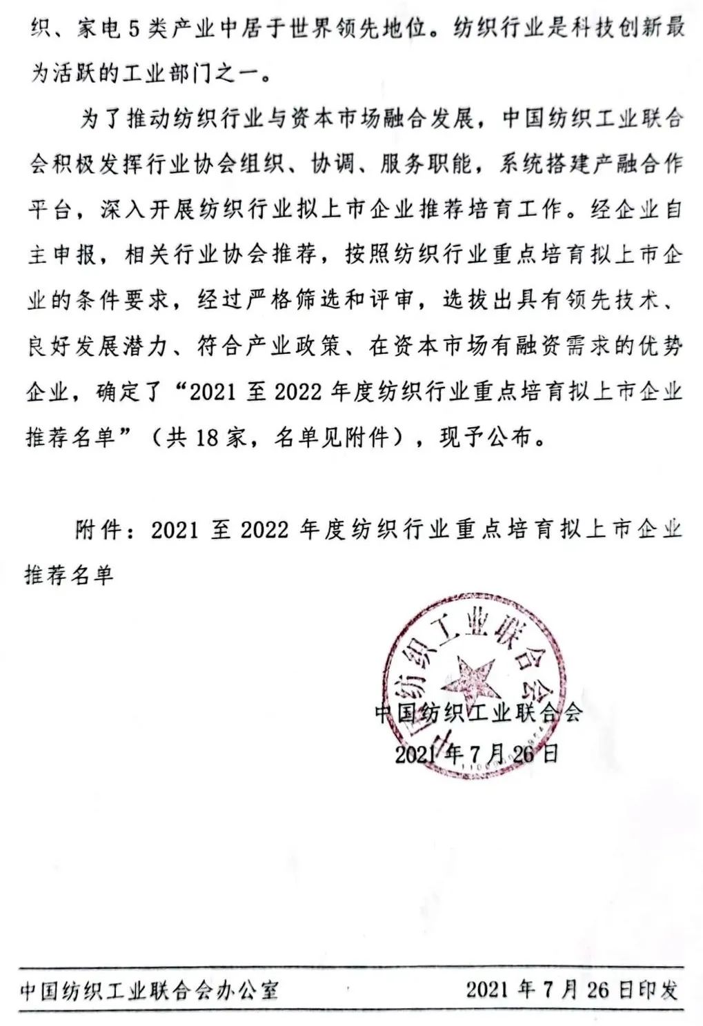 Čínska federácia textilného priemyslu v prvom roku 14. päťročného plánu zrýchľuje integráciu textilného priemyslu a kapitálového trhu. Čínska federácia textilného priemyslu vydala 26. júla oznámenie o zverejnení odporúčaného zoznamu kľúčových podnikov, ktoré majú byť uvedené v textilnom priemysle od roku 2021 do roku 2022. Po prísnom preverovaní a hodnotení sa 18 výhodných podnikov s poprednou technológiou, dobrým rozvojovým potenciálom, v súlade s priemyselnými politikami a potrebami financovania na kapitálovom trhu boli vybrané na vytvorenie zoznamu odporúčaní. Tieto podniky zahŕňajú nové vláknité materiály, inteligentnú výrobu, módnu výstavbu, ekologickú výrobu, špičkové priemyselné textílie a ďalšie oblasti, ktoré sú tiež kľúčovými oblasťami podporovanými textilným „14. päťročným plánom“.